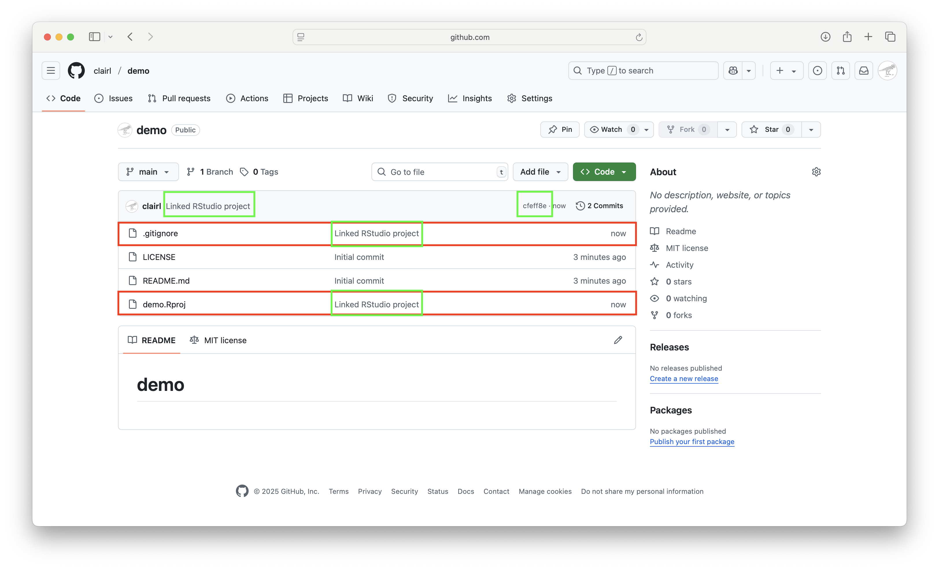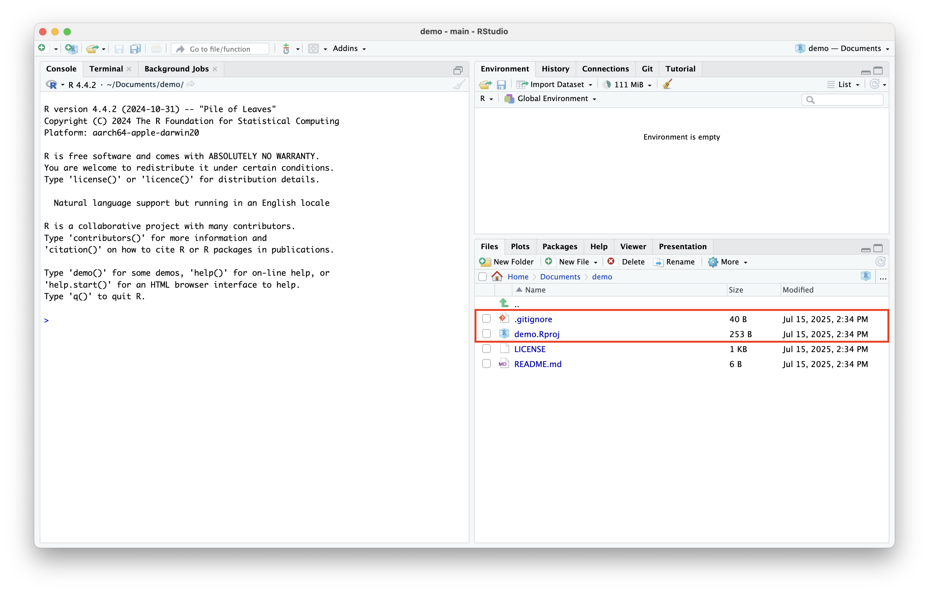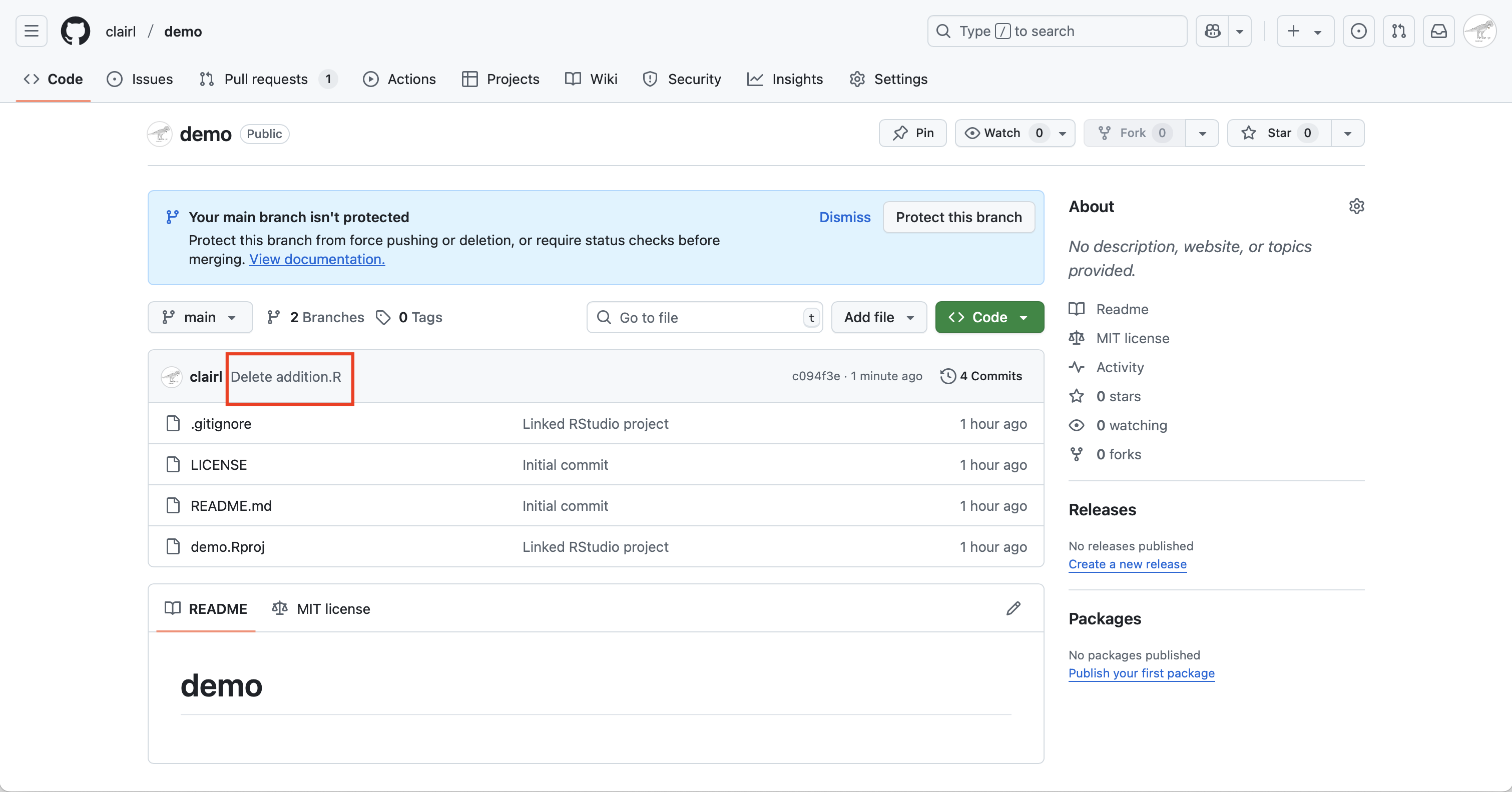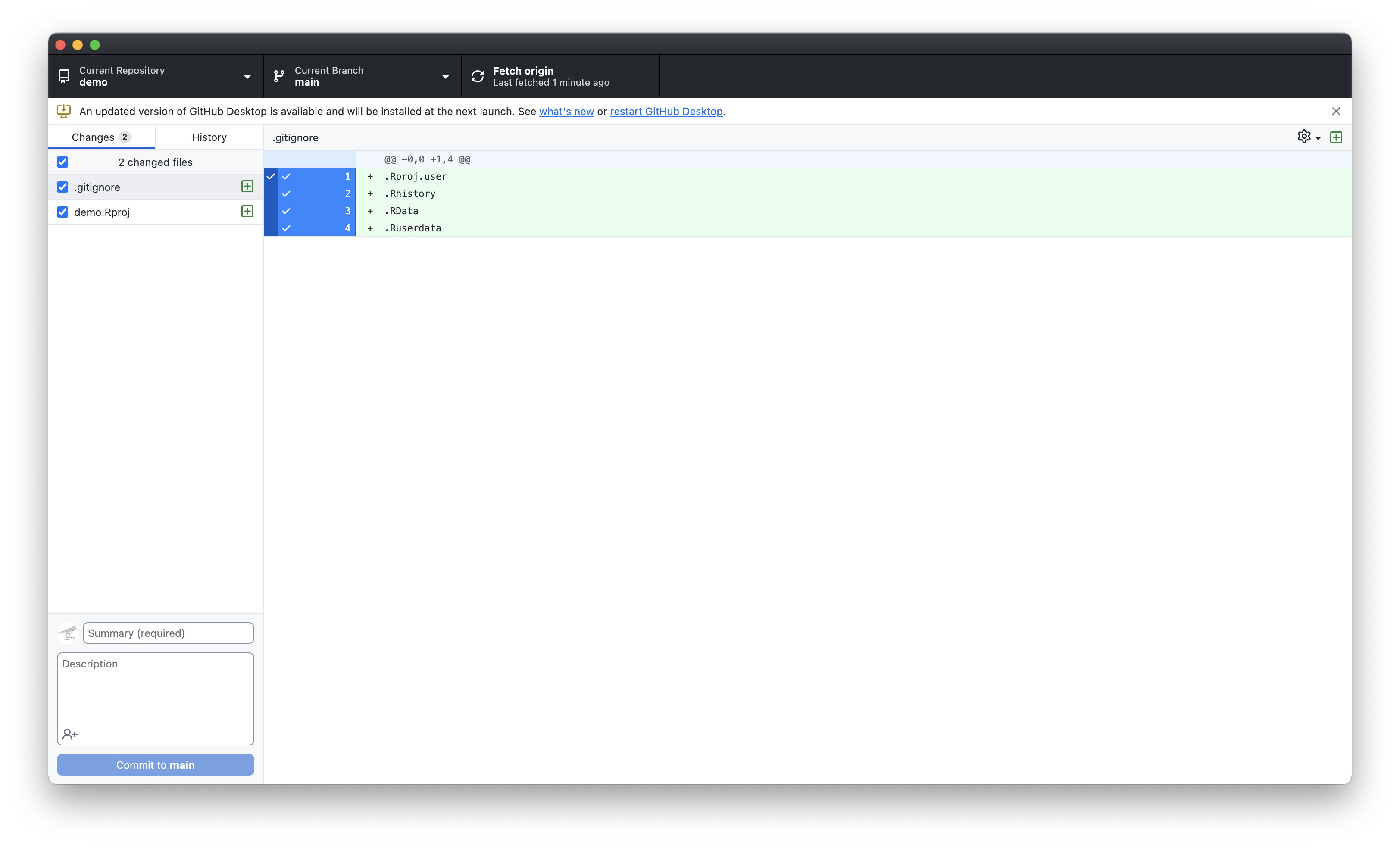 main branch.gitignore and demo.Rproj.gitignore files are special files where we include a list of files we want to exclude from our GitHub repository