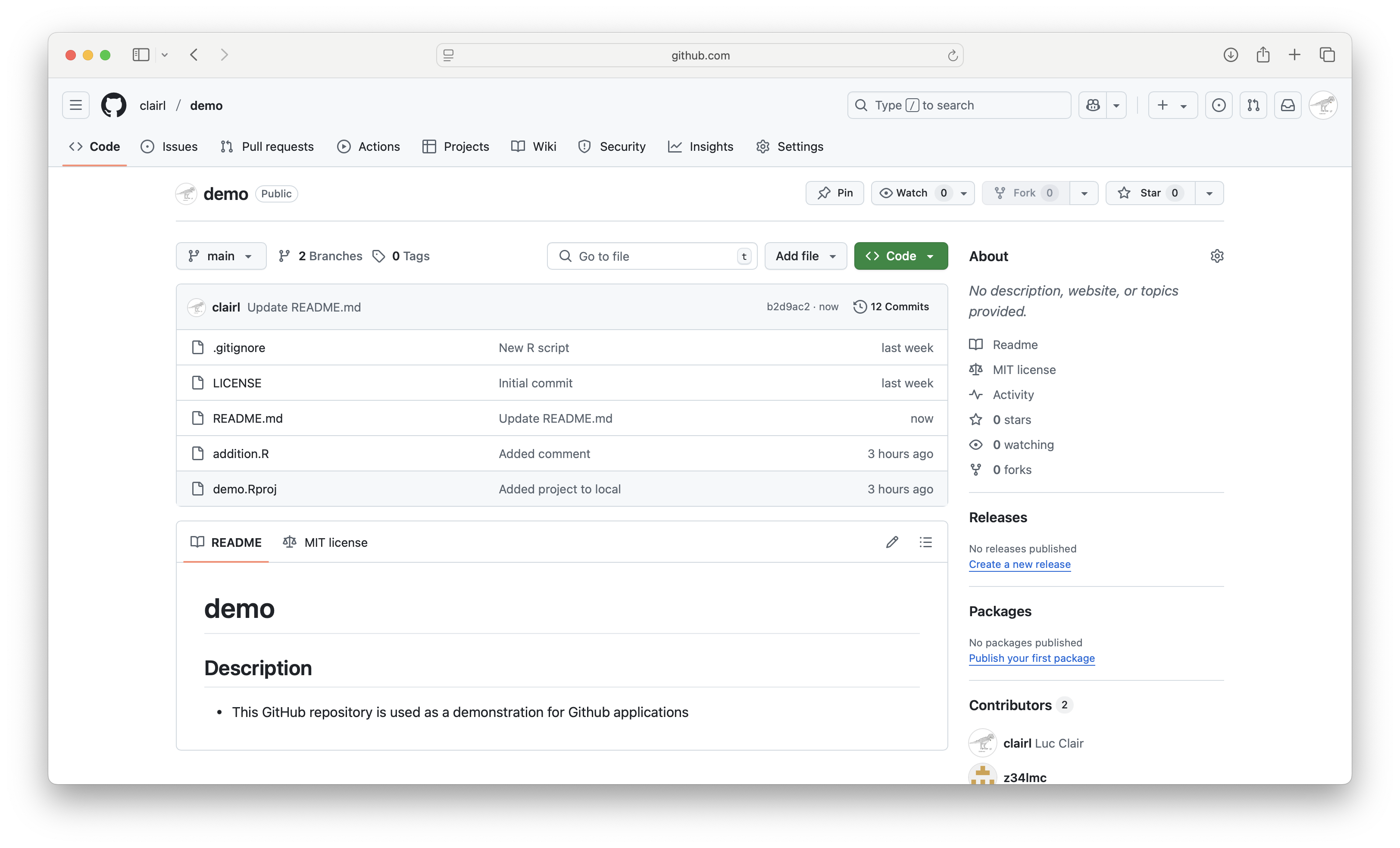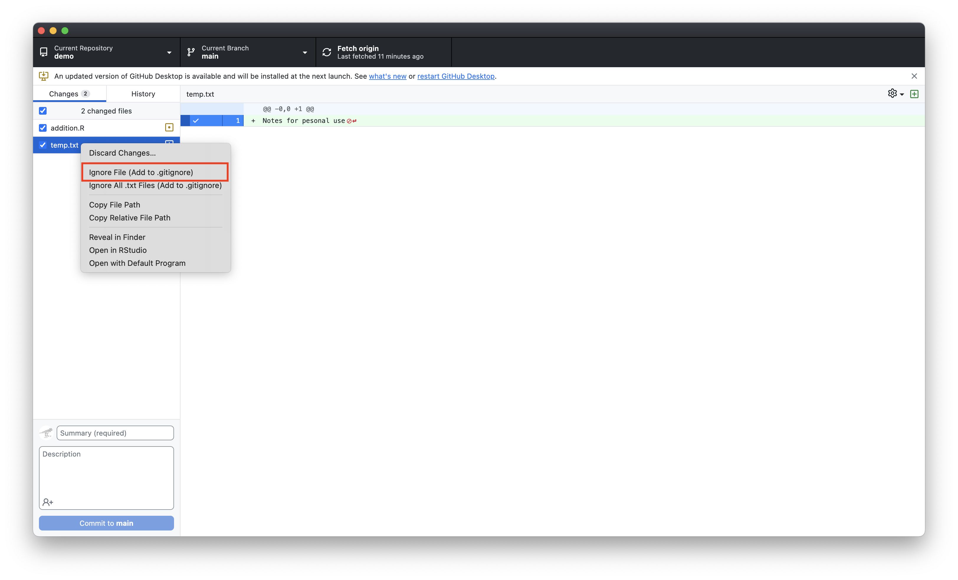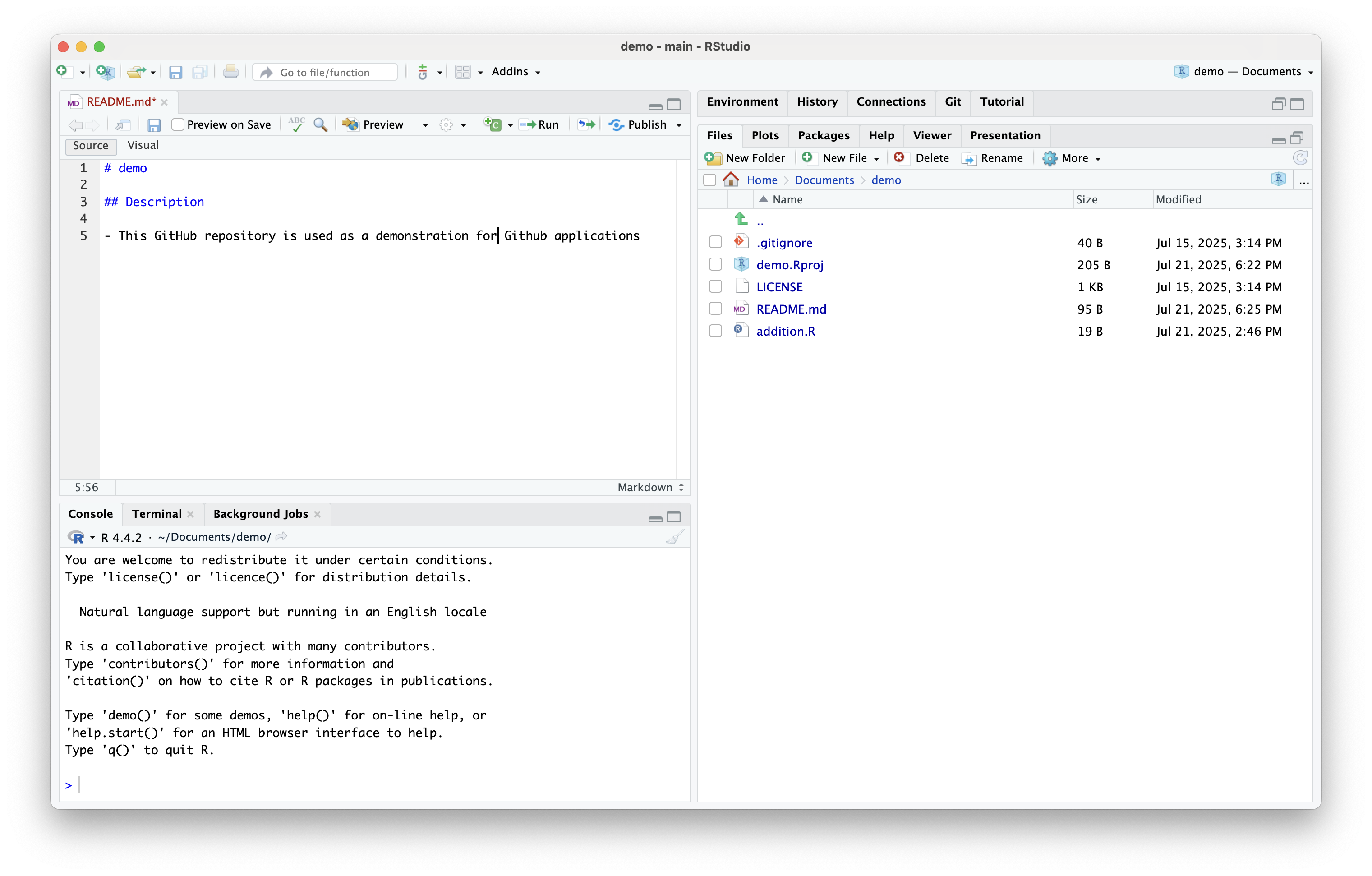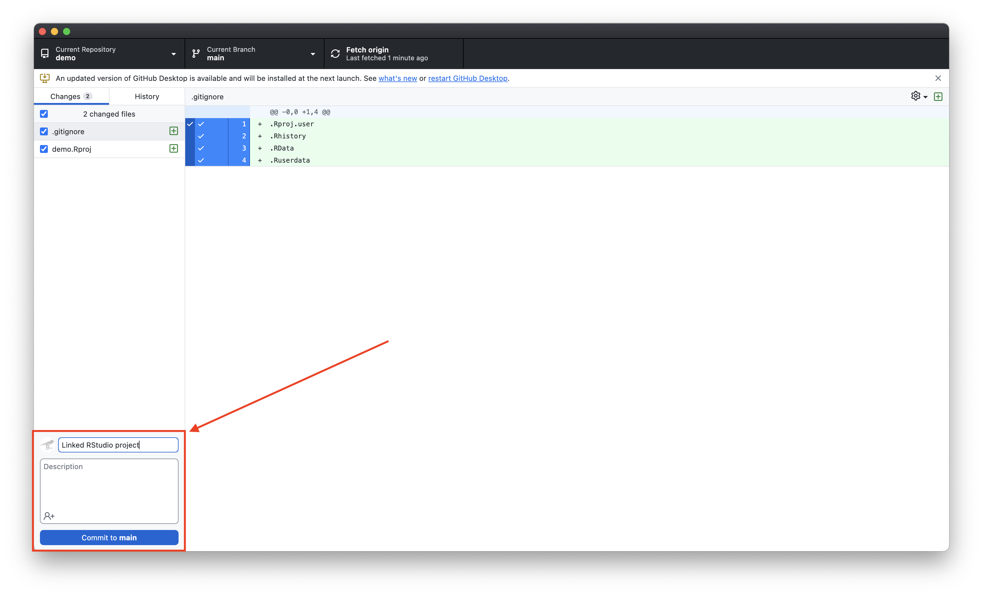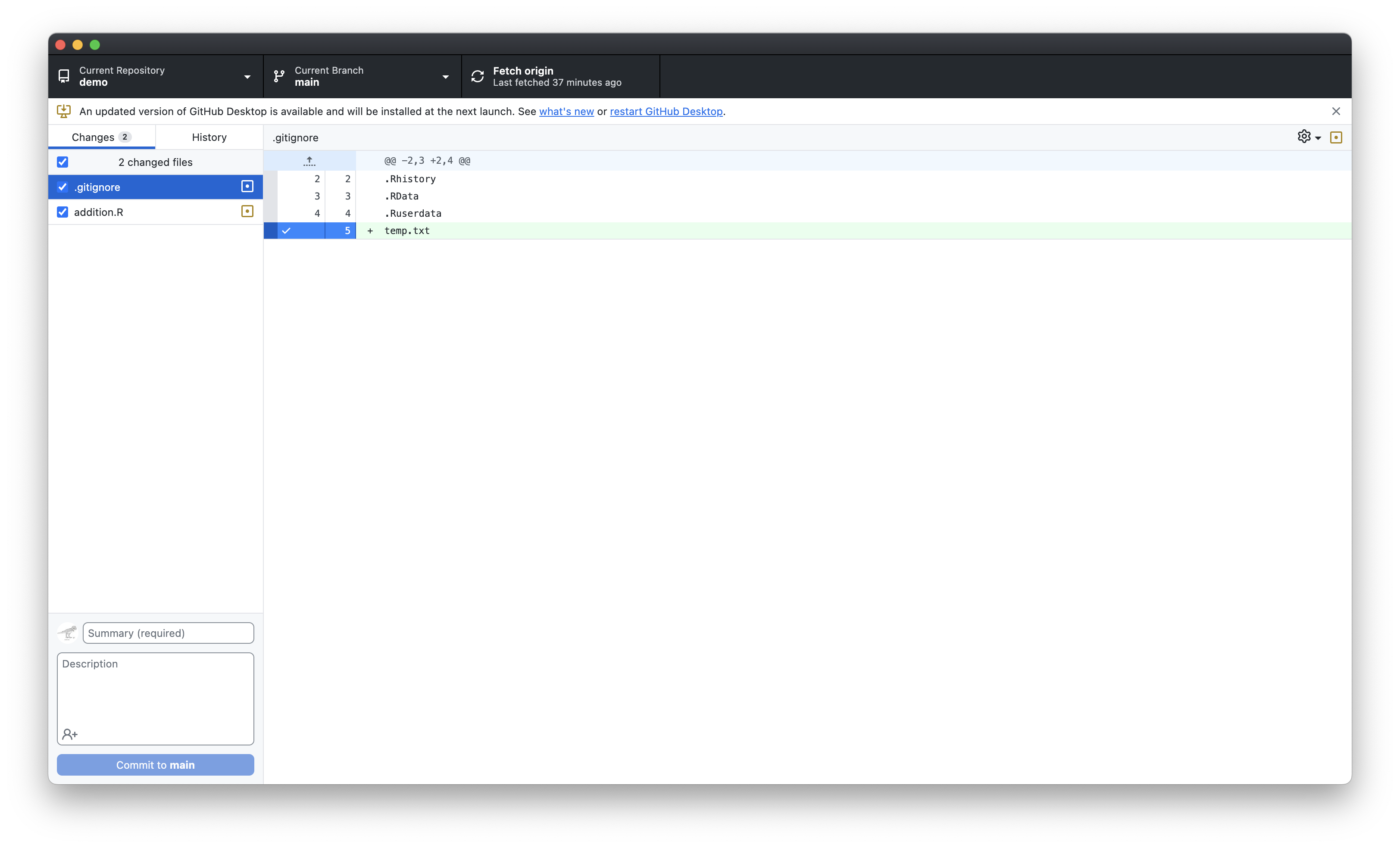 main branch.gitignore and demo.Rproj.gitignore files are special files where we include a list of files we want to exclude from our GitHub repository
