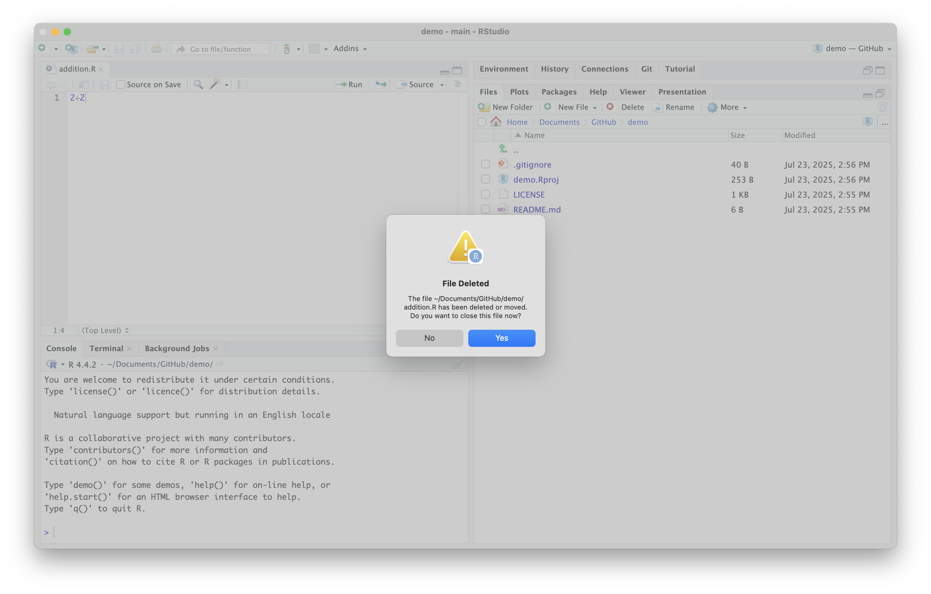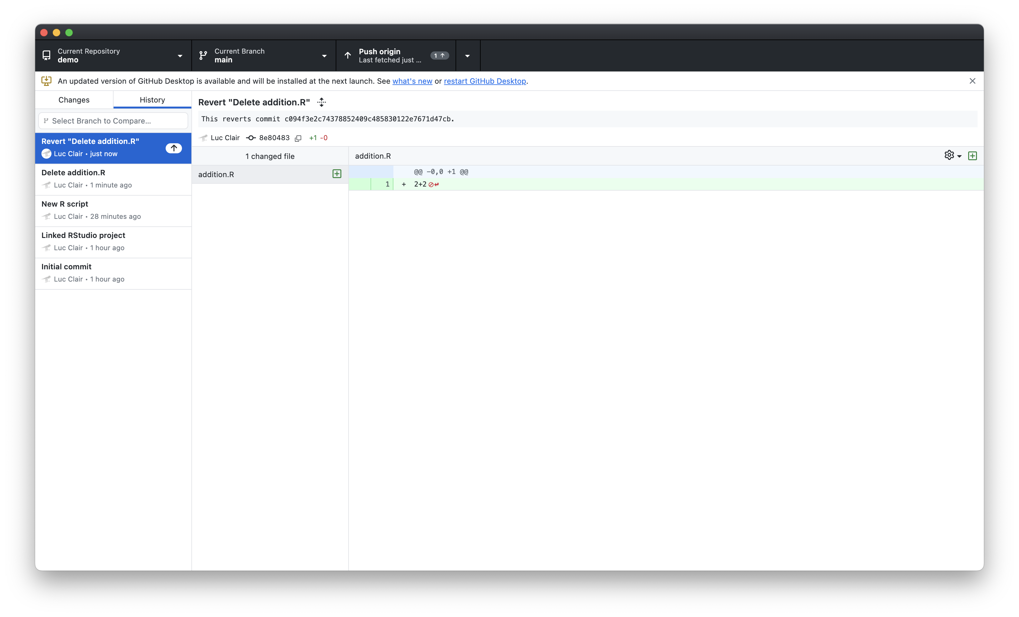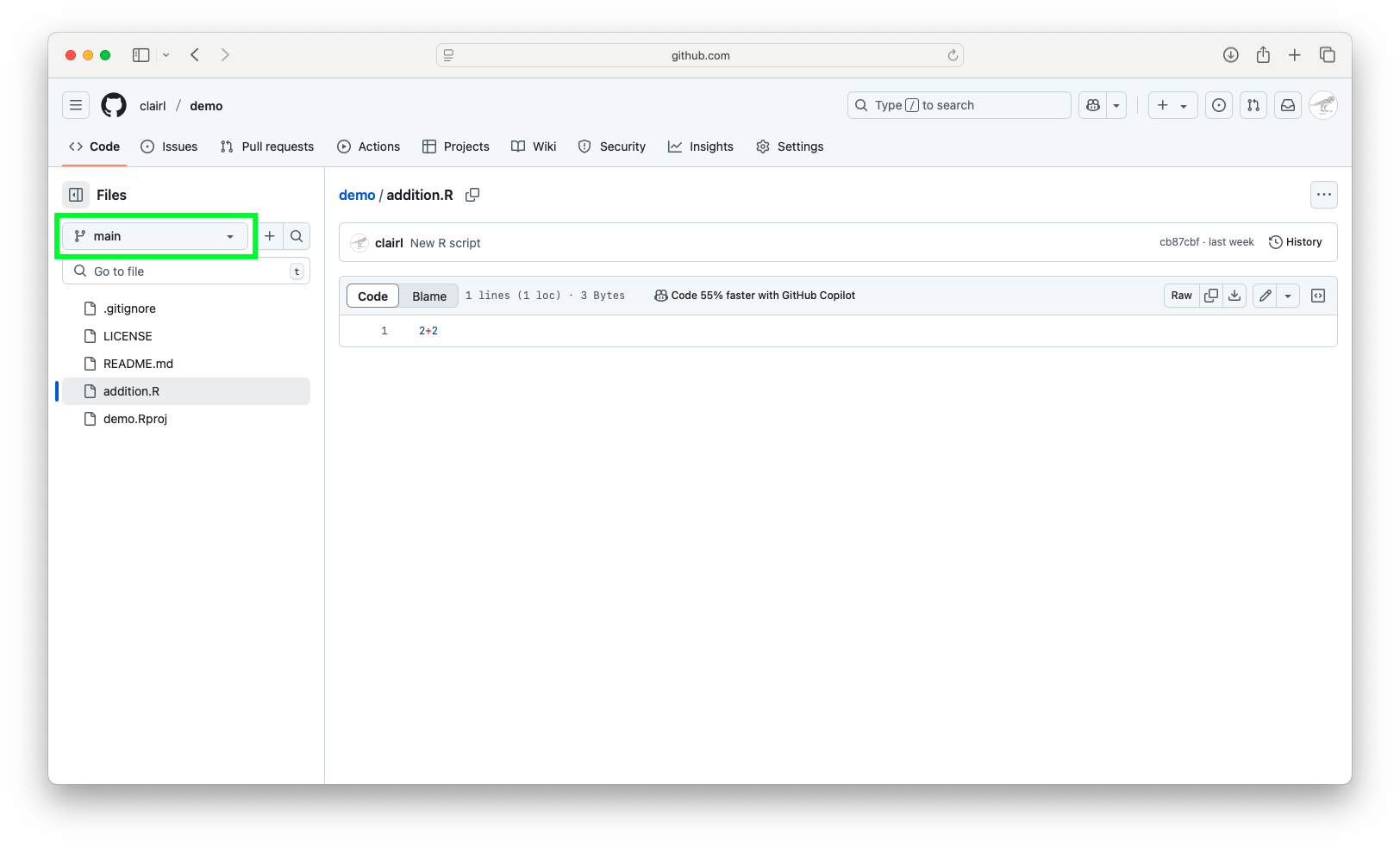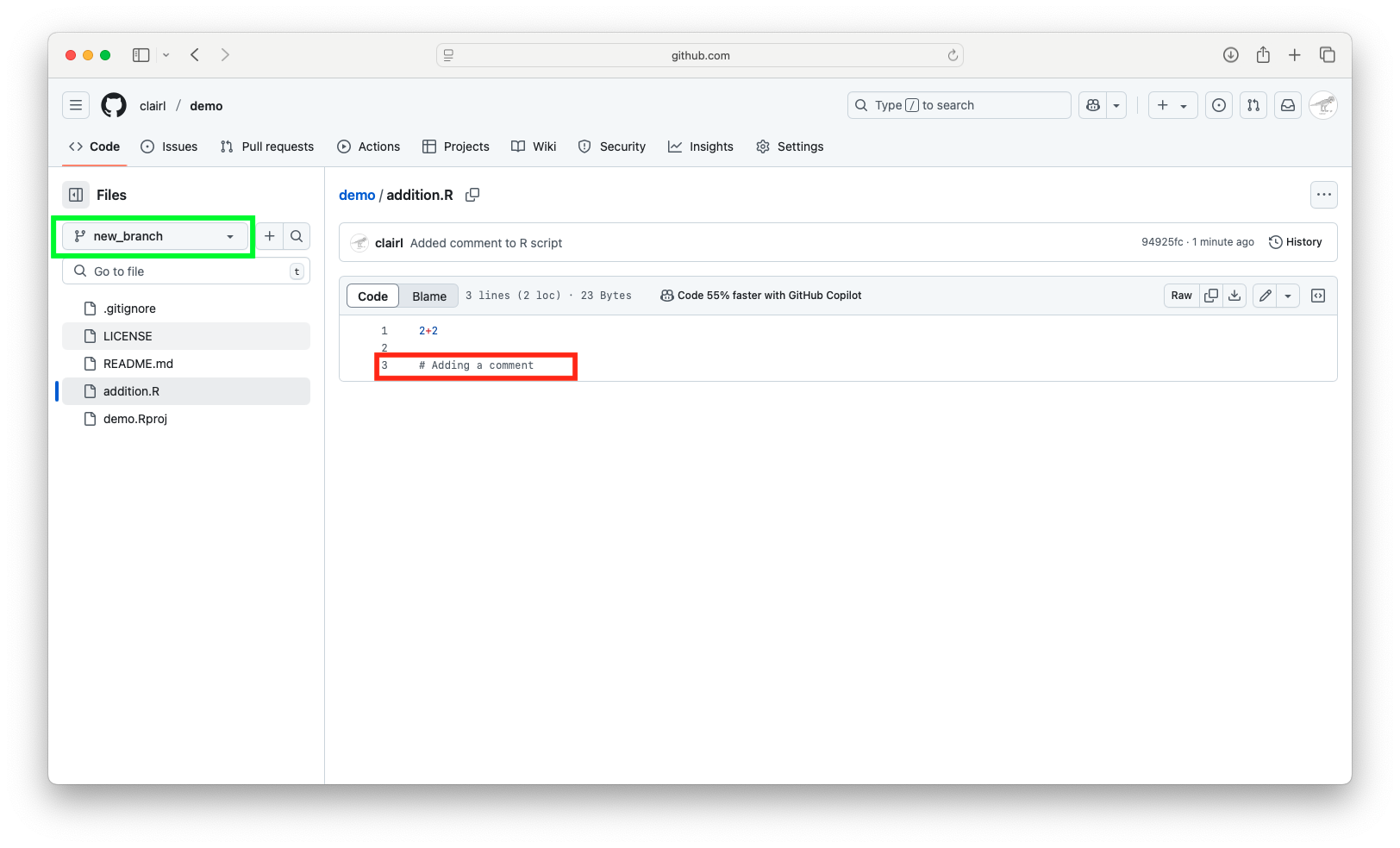 demo.Rproj is the R project file.gitignore and demo.Rproj are now on GitHub.com2+2addition.Raddition.R is a new file, which is why we see green plus signaddition.Raddition.R has been removed from the origin repoaddition.R is back in the repomain (older repos may use master)Creating a new branch is akin to creating a parallel universe for your project