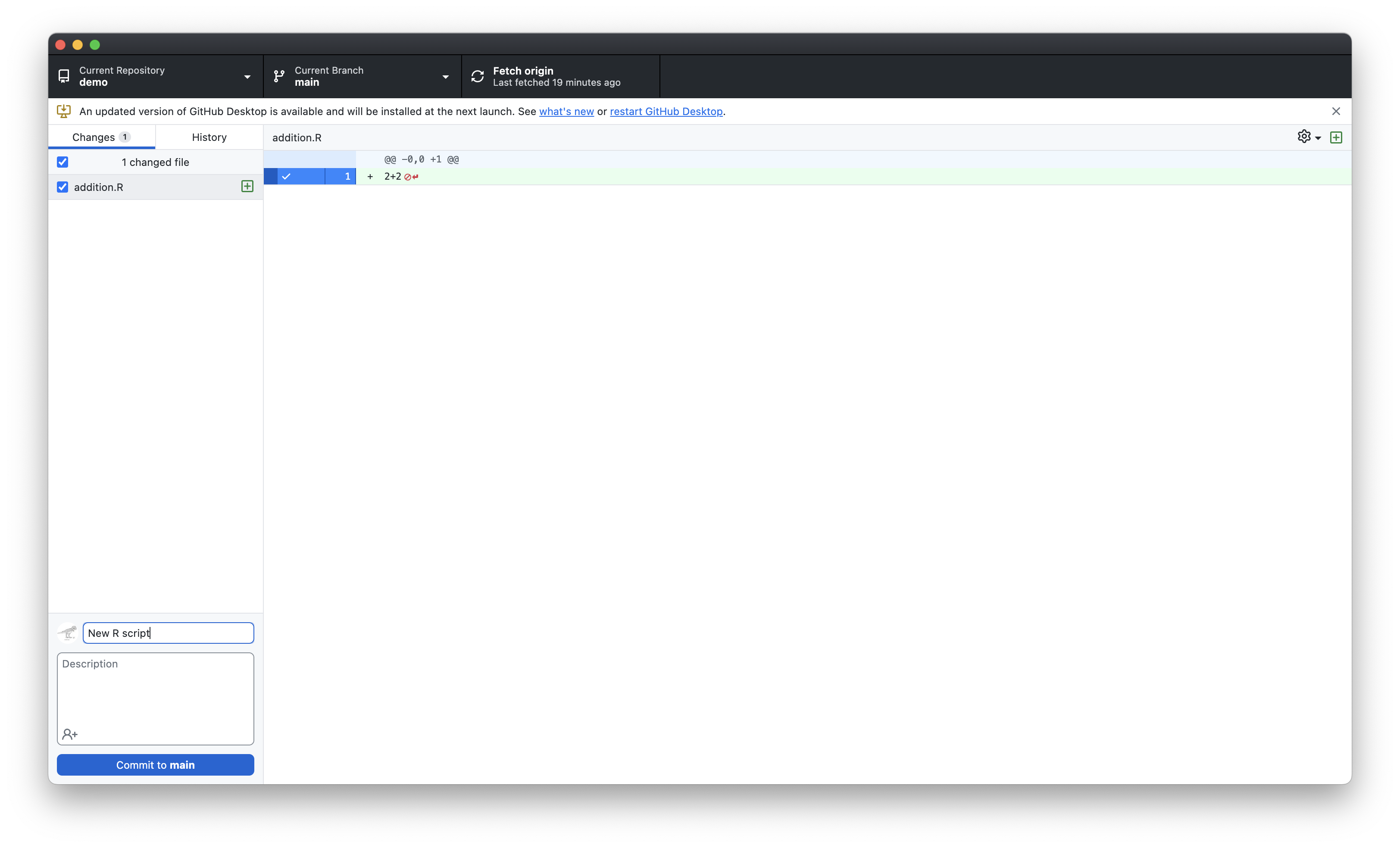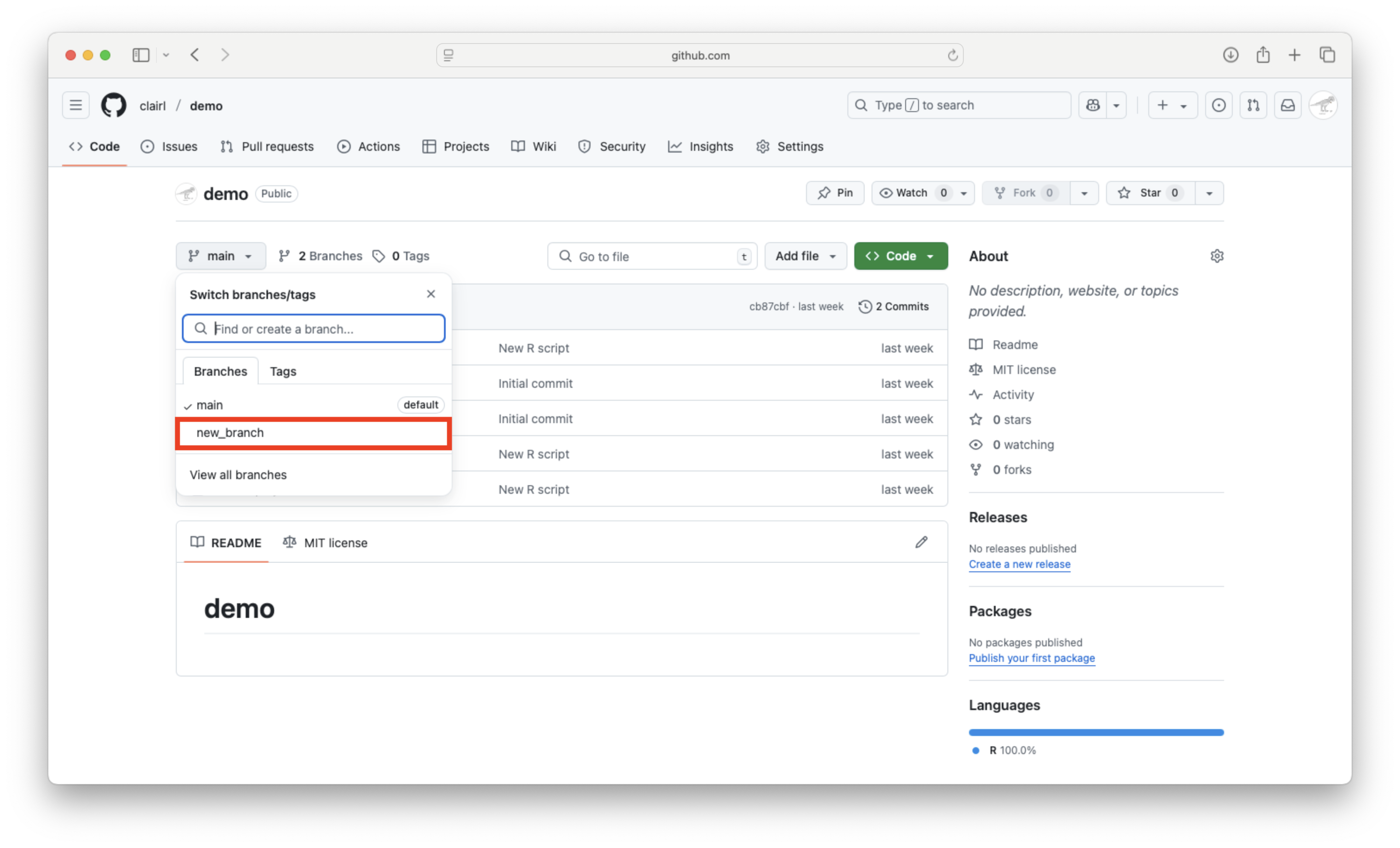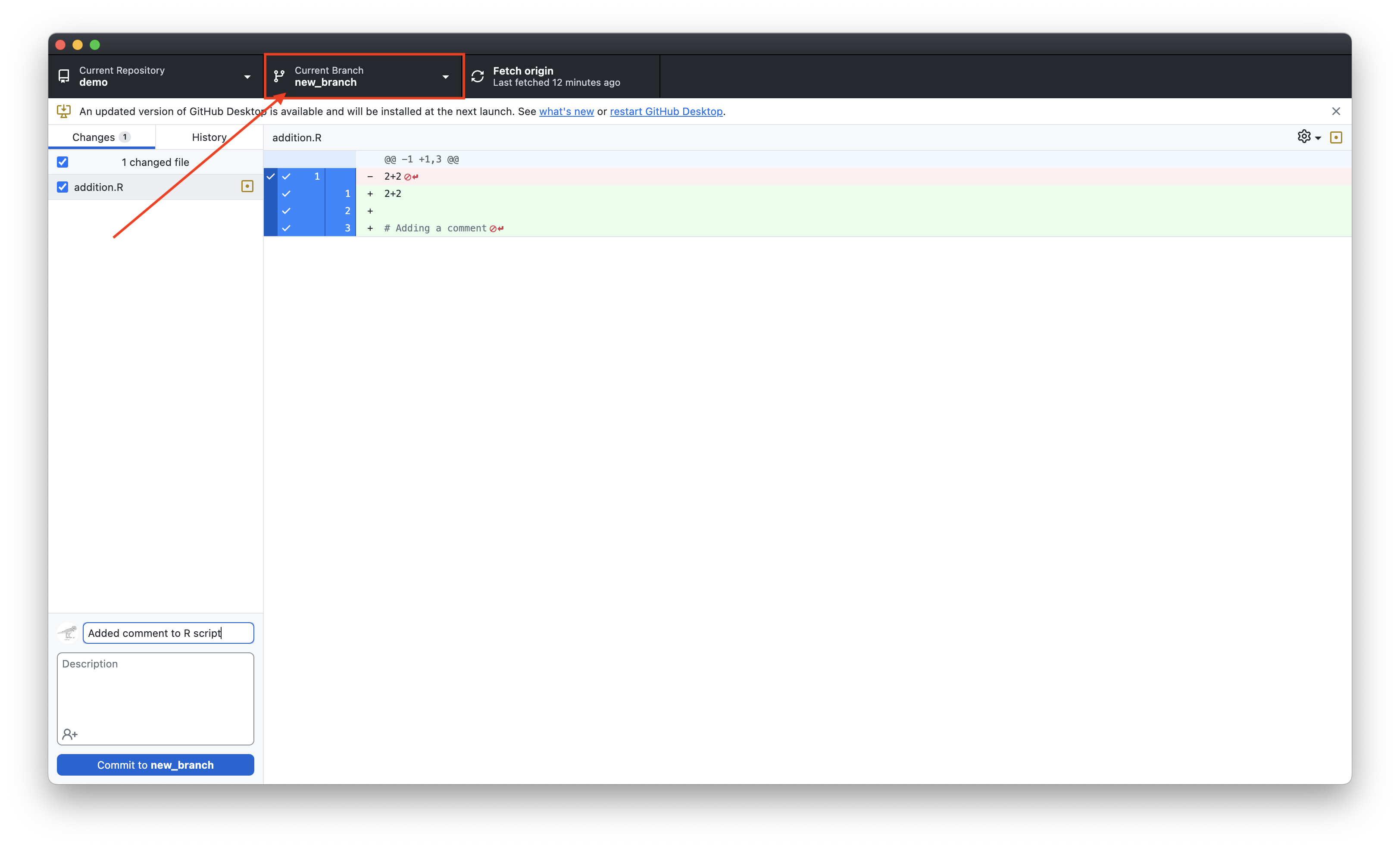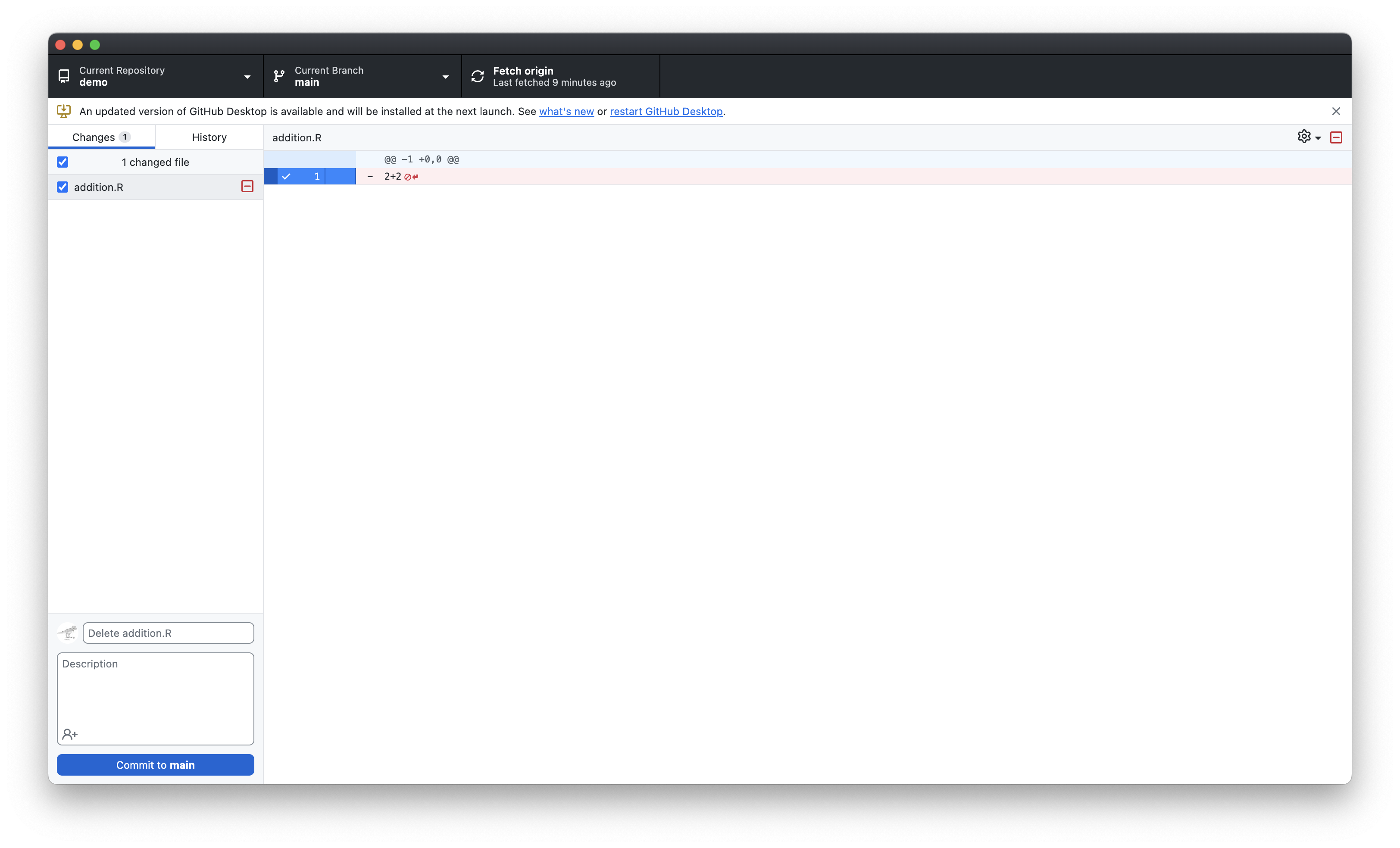 demo.Rproj is the R project file.gitignore and demo.Rproj are now on GitHub.com2+2addition.Raddition.R is a new file, which is why we see green plus signaddition.Raddition.R has been removed from the origin repoaddition.R is back in the repomain (older repos may use master)Creating a new branch is akin to creating a parallel universe for your project