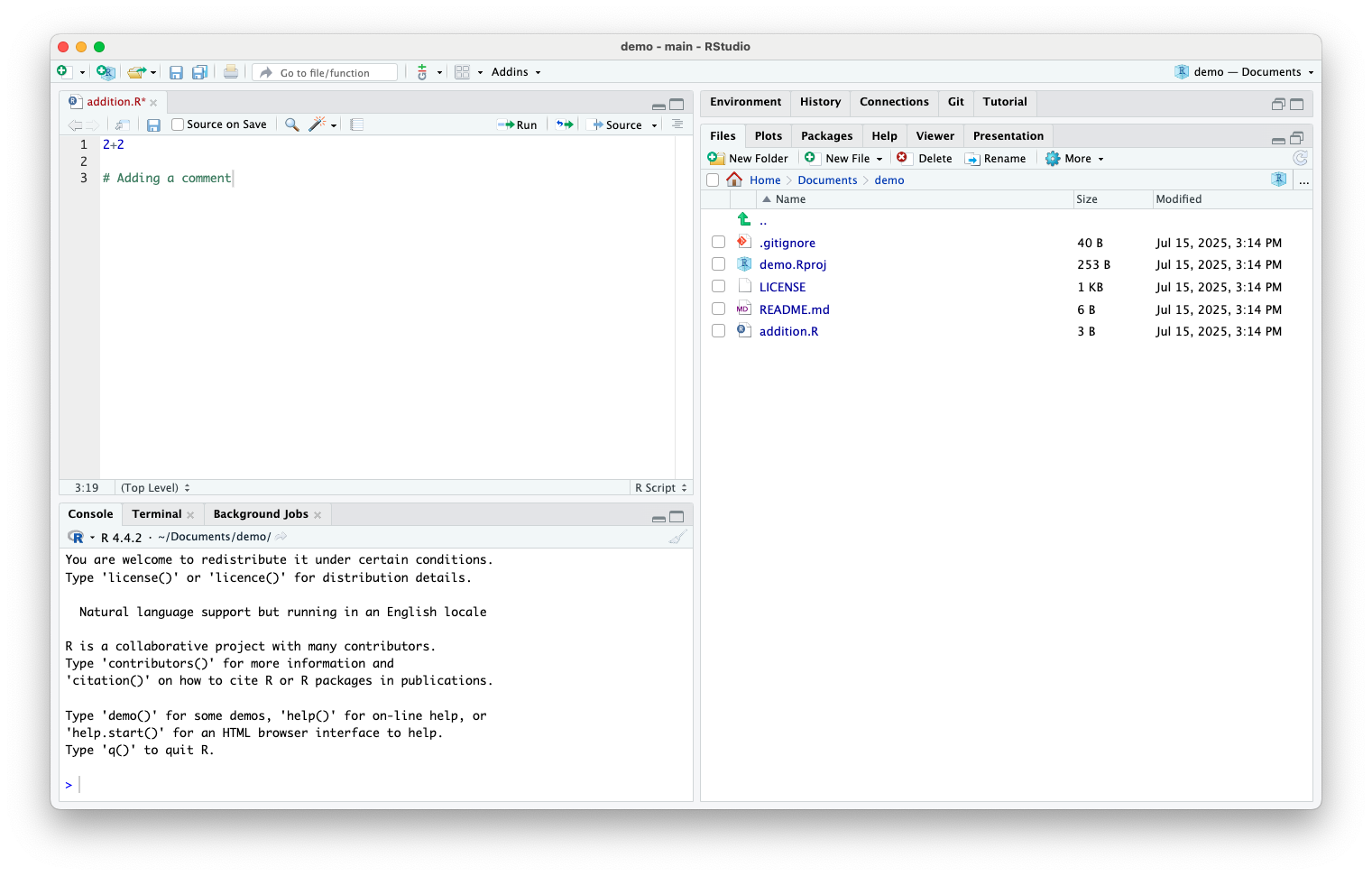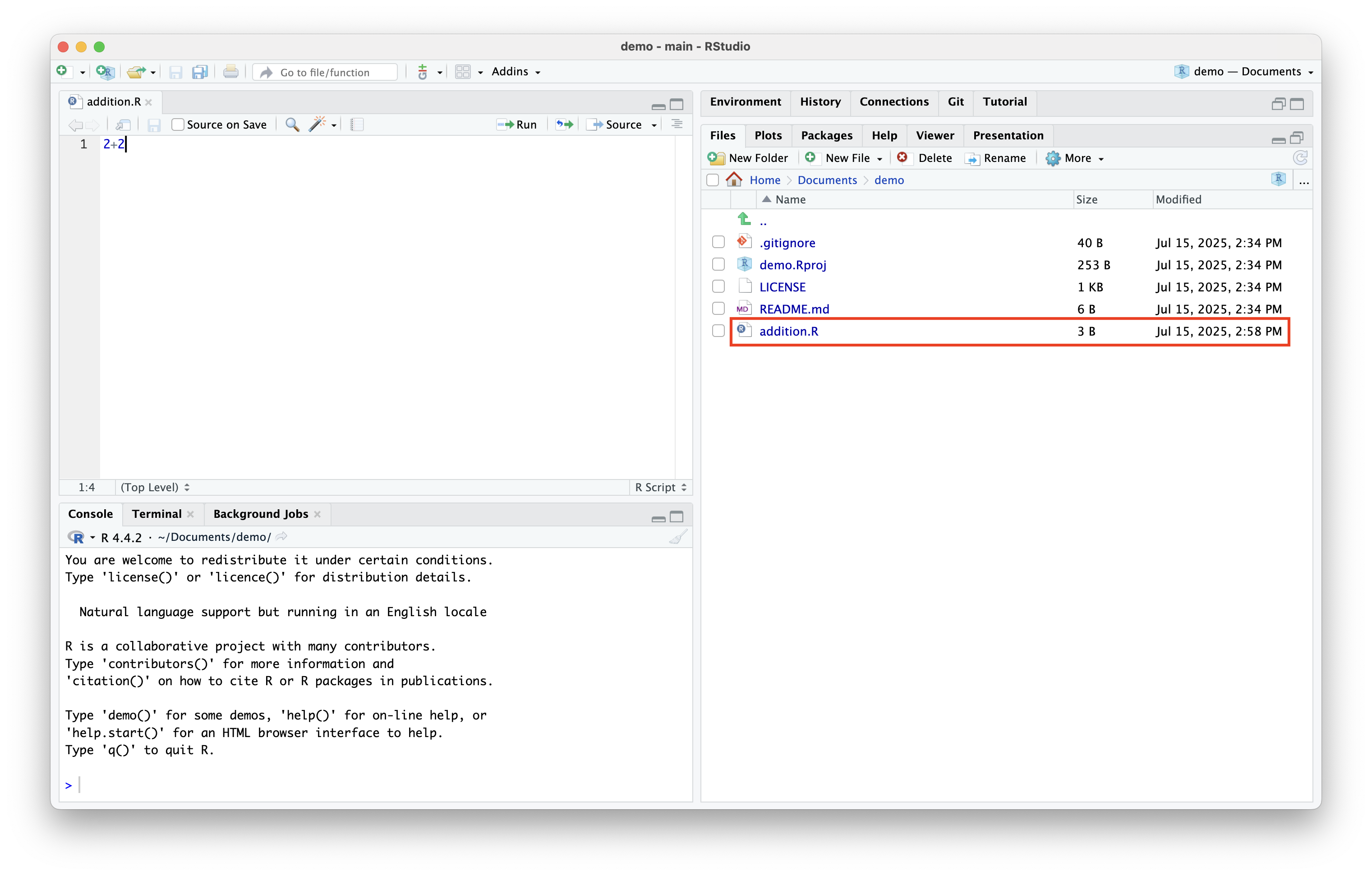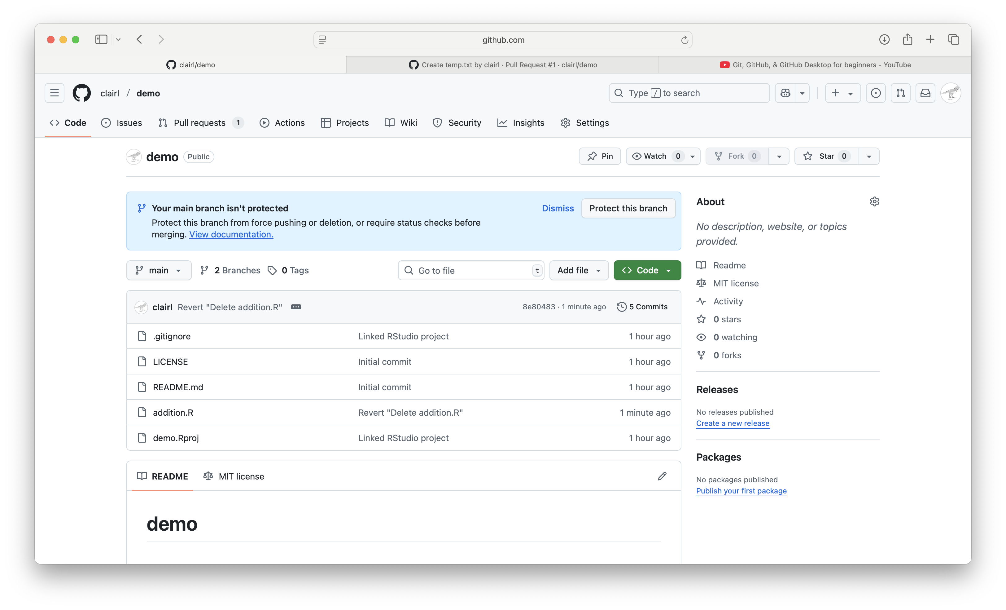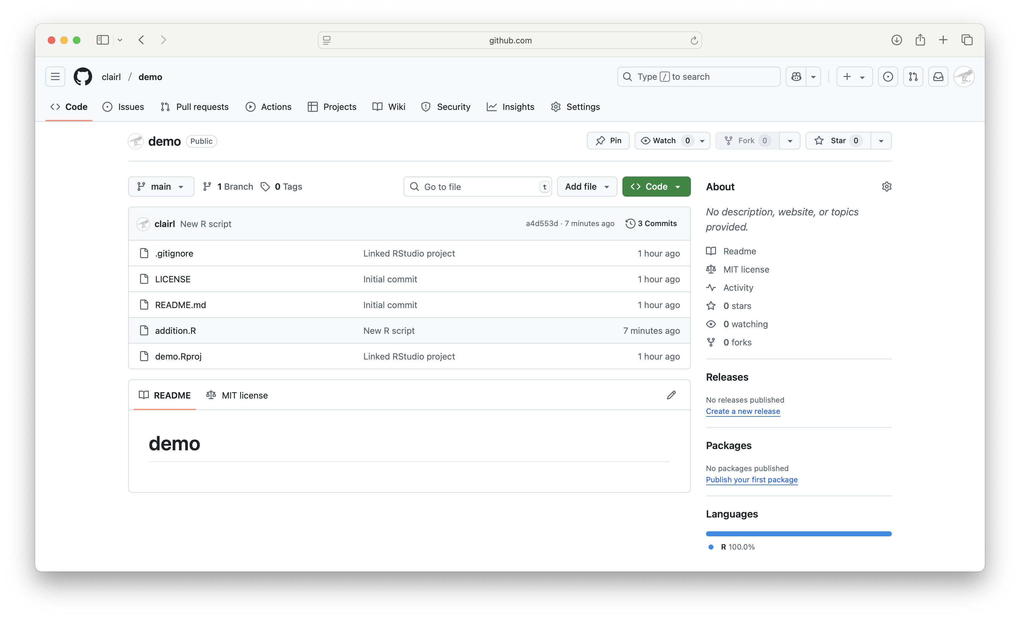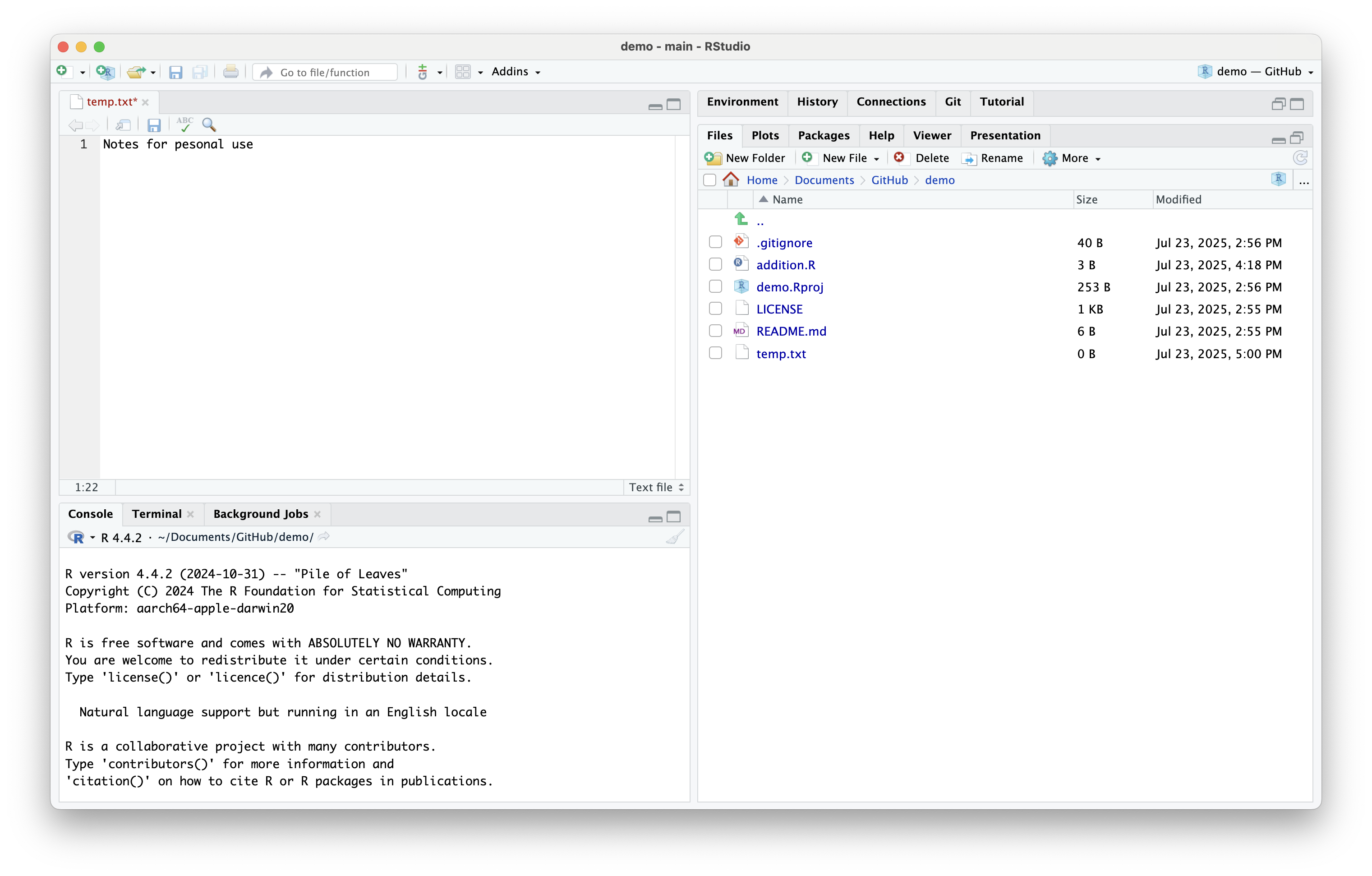 demo.Rproj is the R project file.gitignore and demo.Rproj are now on GitHub.com2+2addition.Raddition.R is a new file, which is why we see green plus signaddition.Raddition.R has been removed from the origin repoaddition.R is back in the repomain (older repos may use master)Creating a new branch is akin to creating a parallel universe for your project