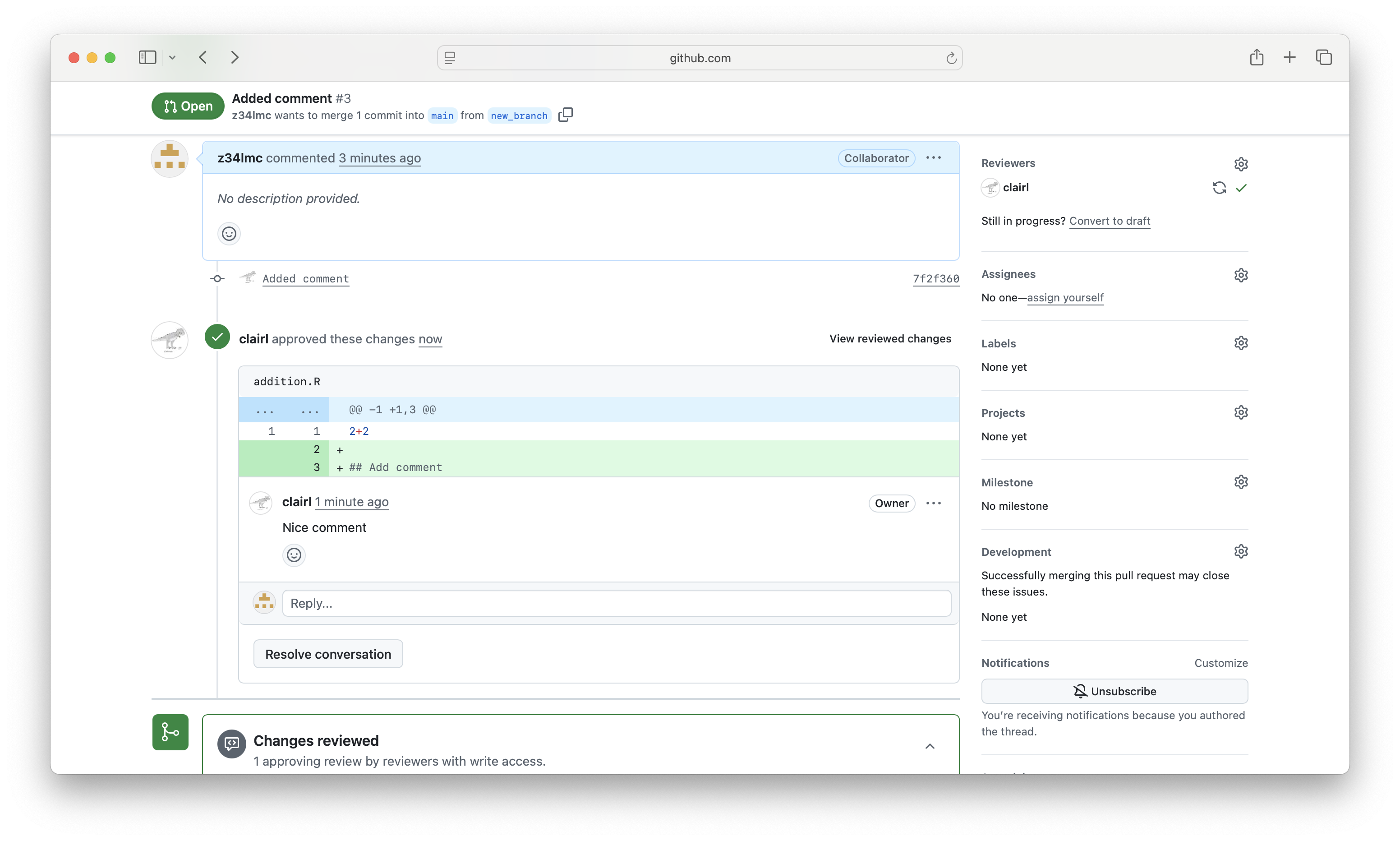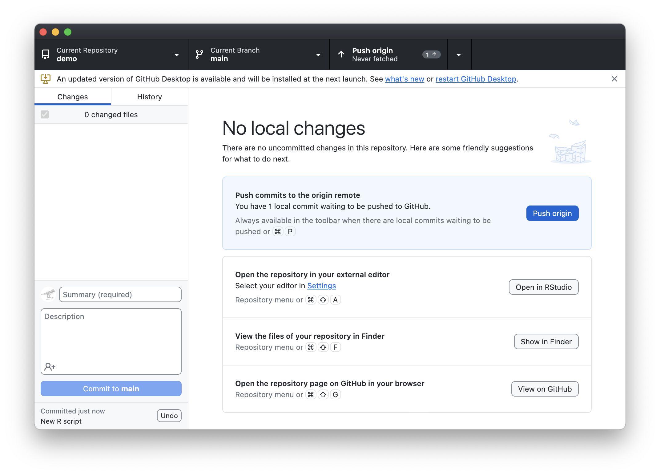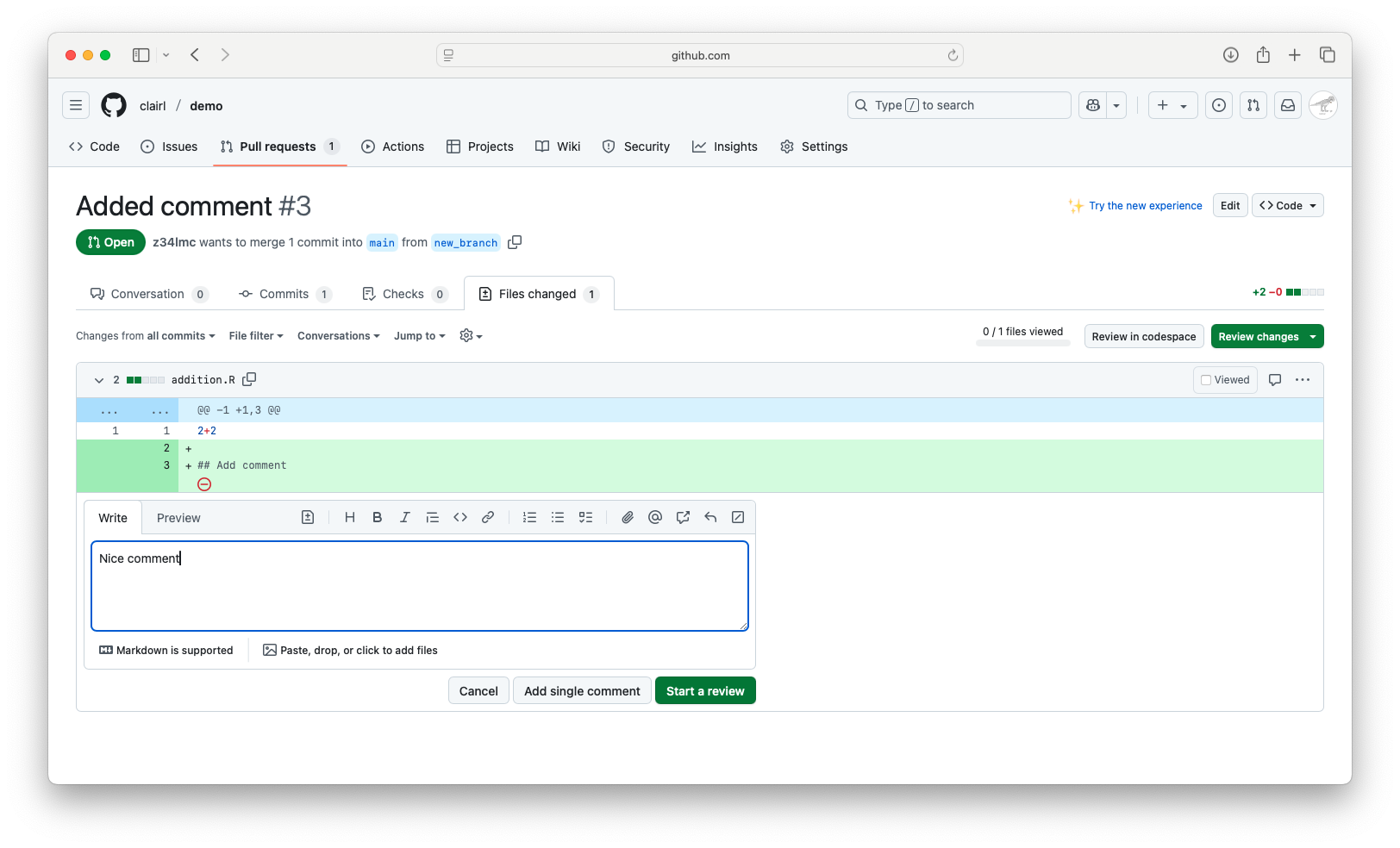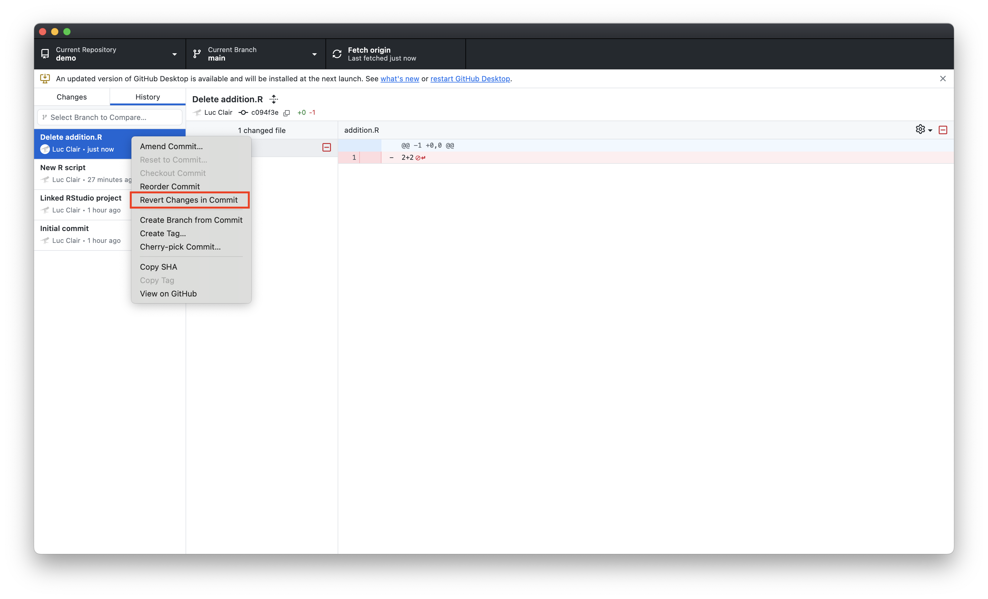 demo.Rproj is the R project file.gitignore and demo.Rproj are now on GitHub.com2+2addition.Raddition.R is a new file, which is why we see green plus signaddition.Raddition.R has been removed from the origin repoaddition.R is back in the repomain (older repos may use master)Creating a new branch is akin to creating a parallel universe for your project