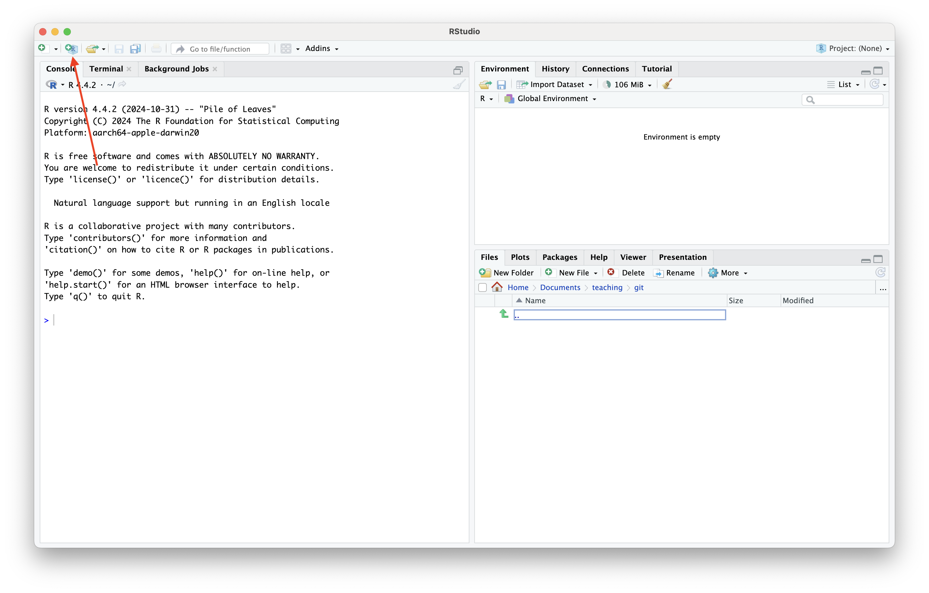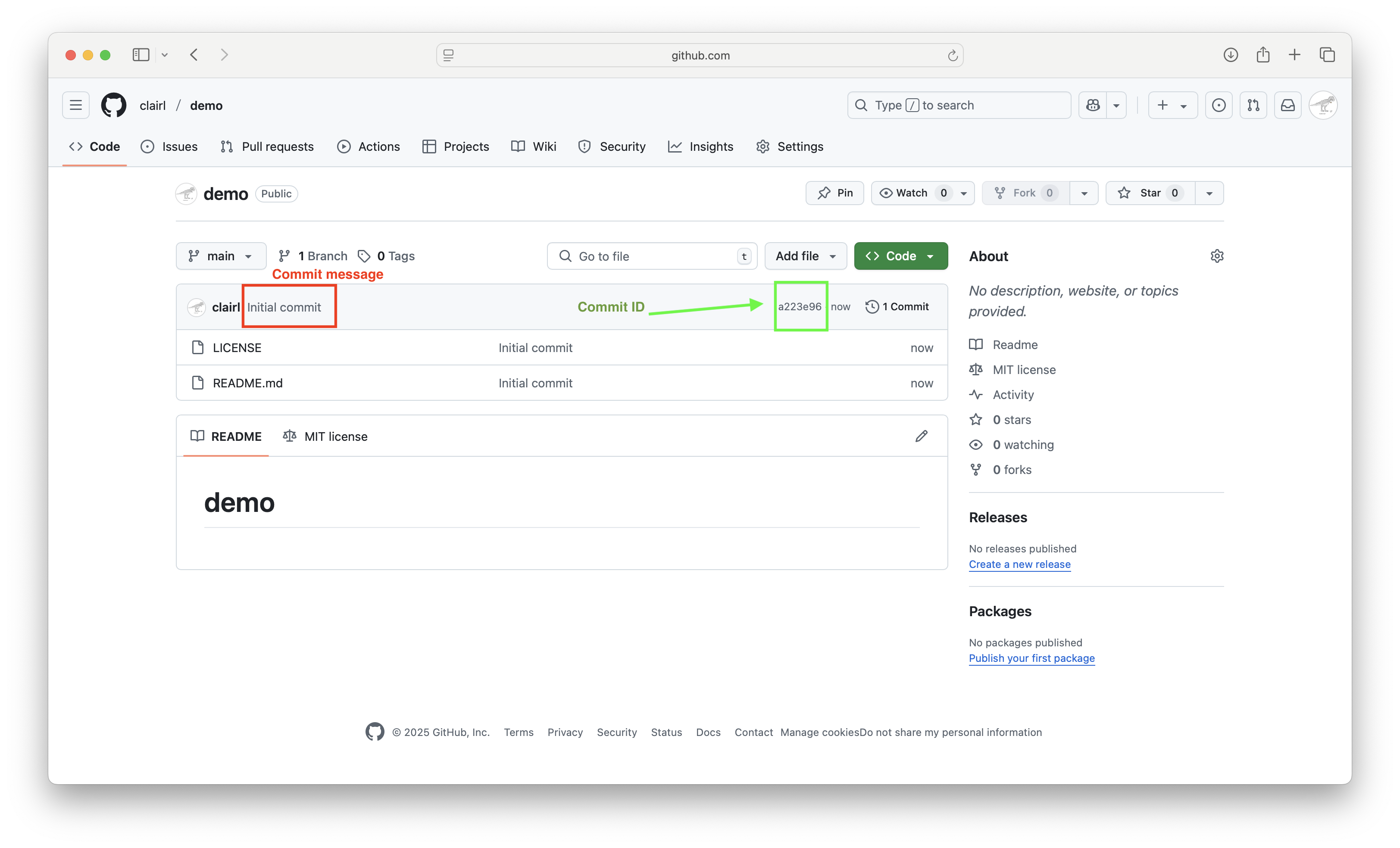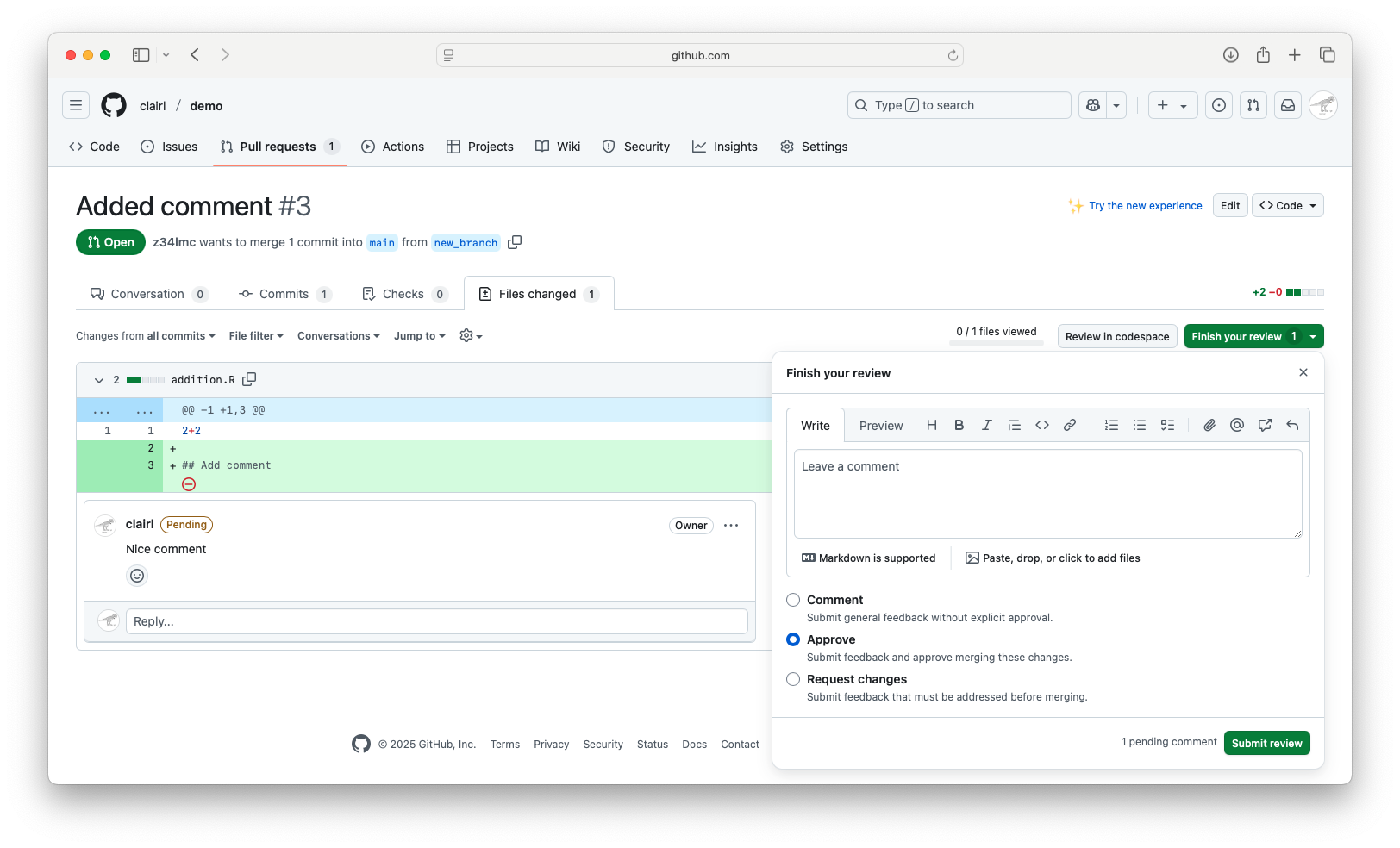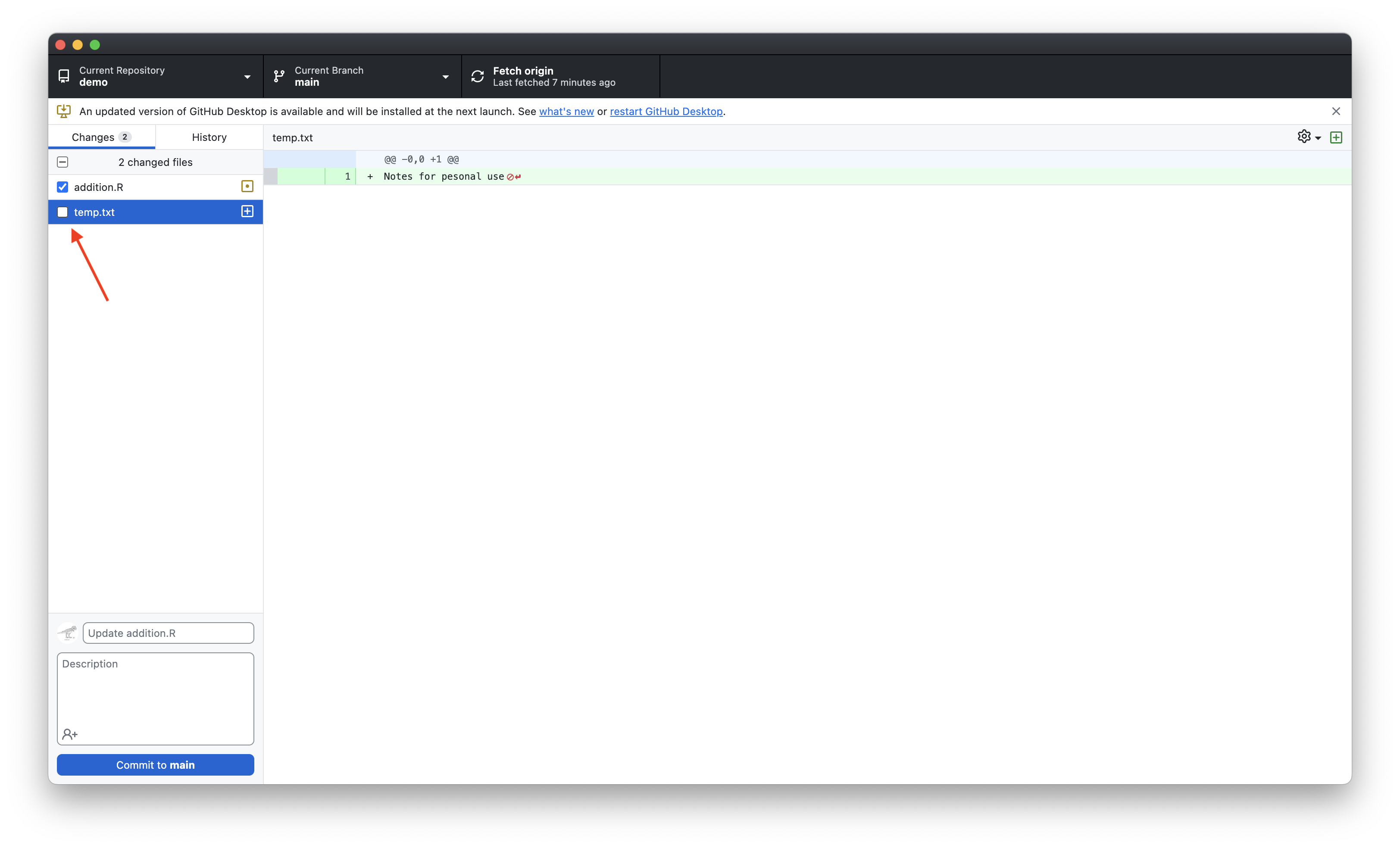 demo.Rproj is the R project file.gitignore and demo.Rproj are now on GitHub.com2+2addition.Raddition.R is a new file, which is why we see green plus signaddition.Raddition.R has been removed from the origin repoaddition.R is back in the repomain (older repos may use master)Creating a new branch is akin to creating a parallel universe for your project