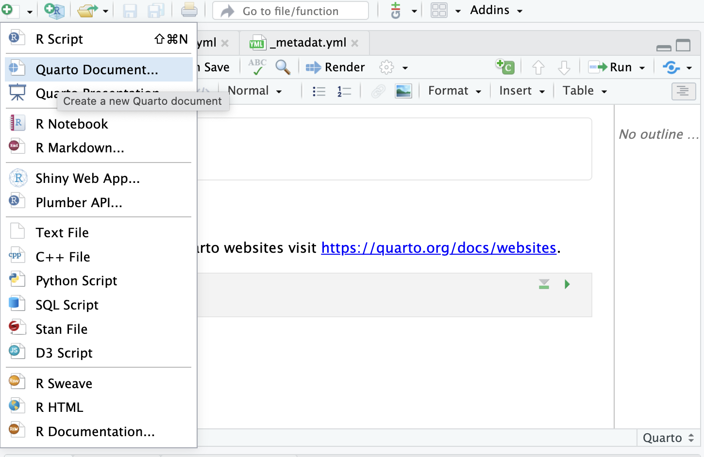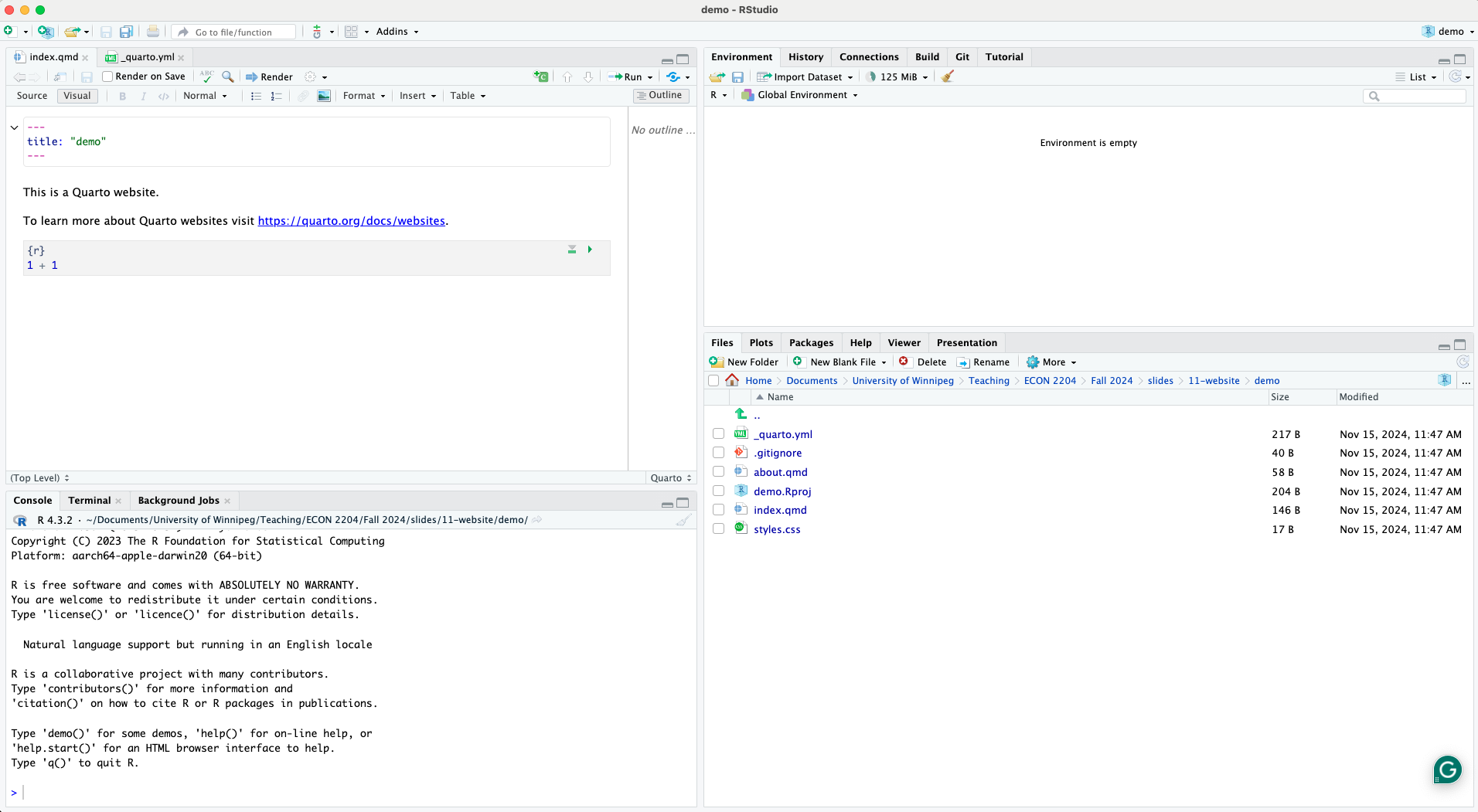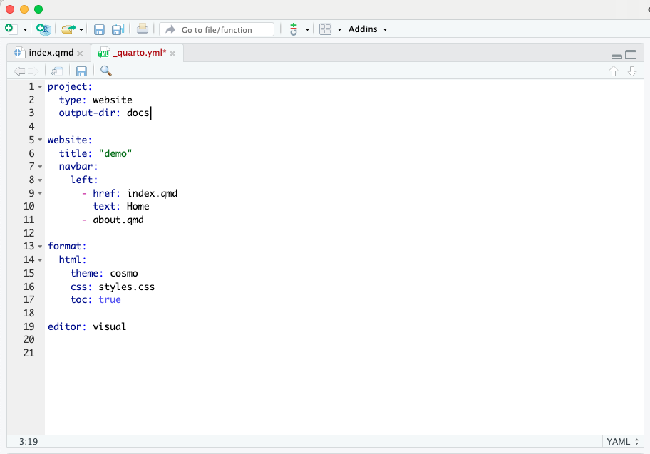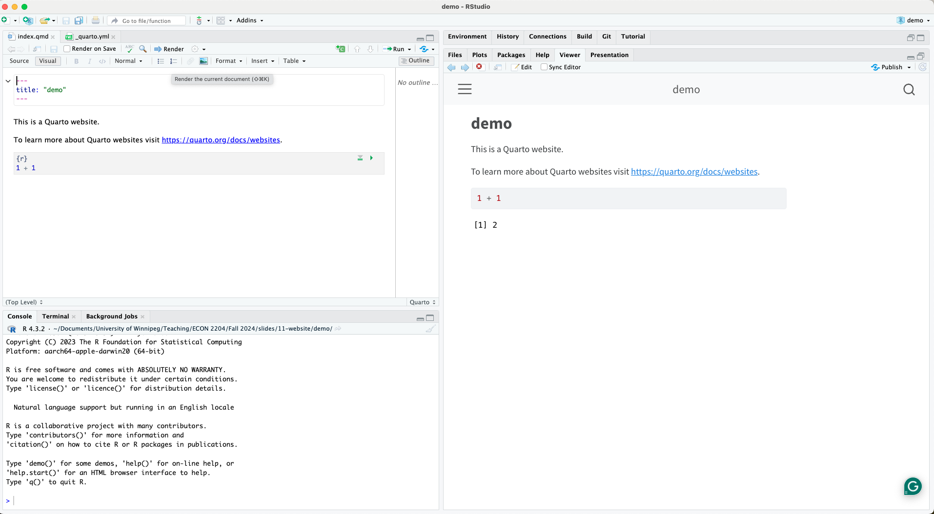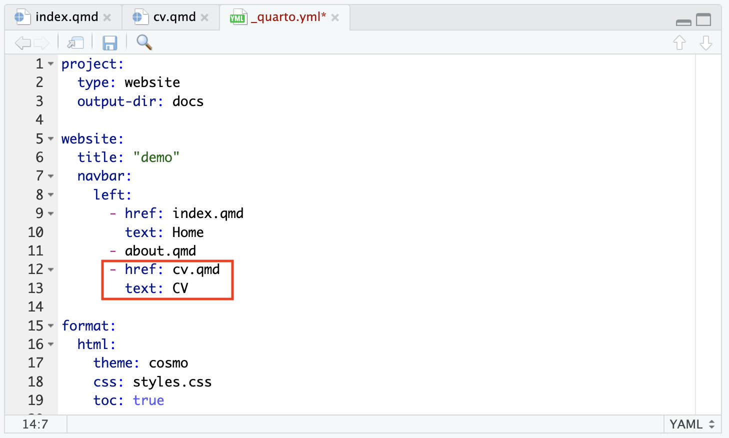 project:title: and description:navbar:format:, theme:, css:To build the website, click the Render button at the top of the index.qmd file.