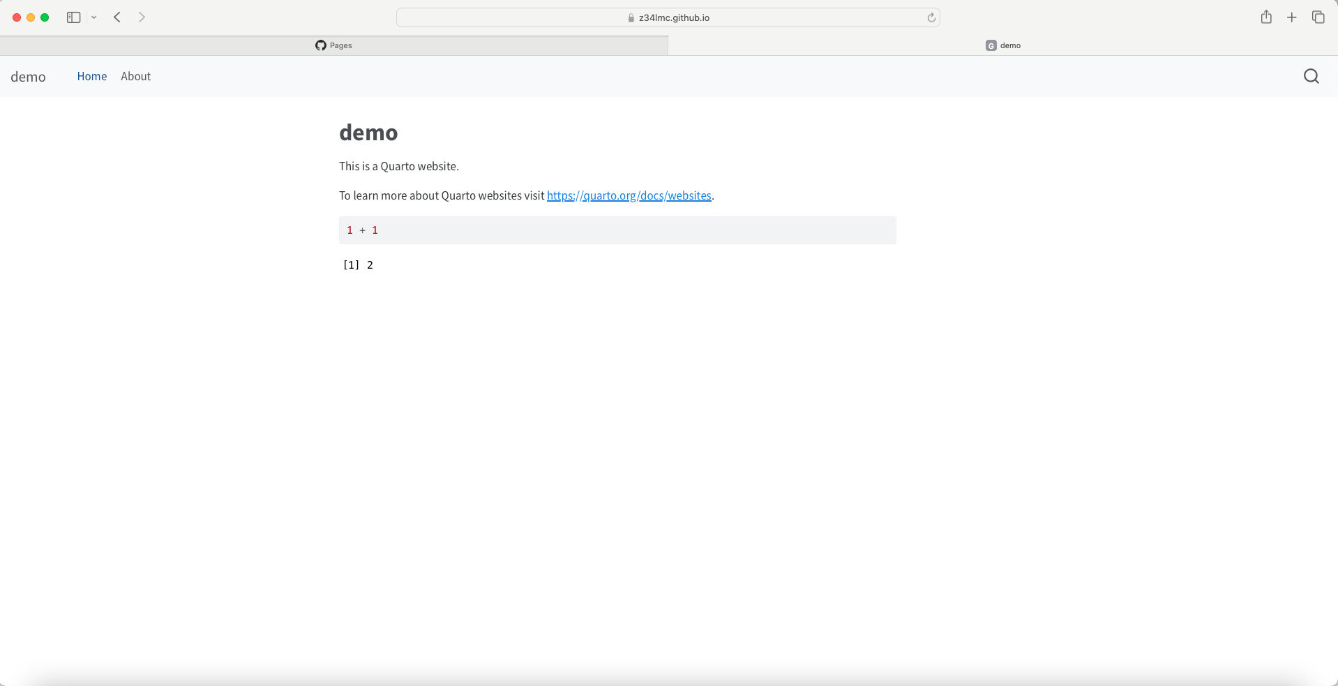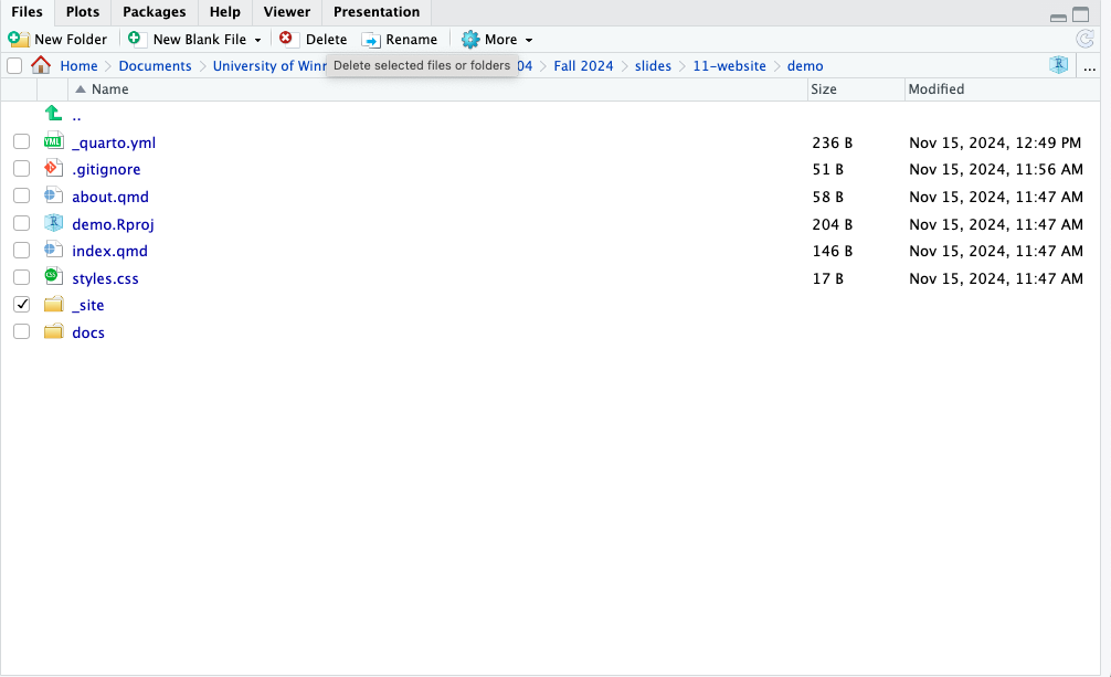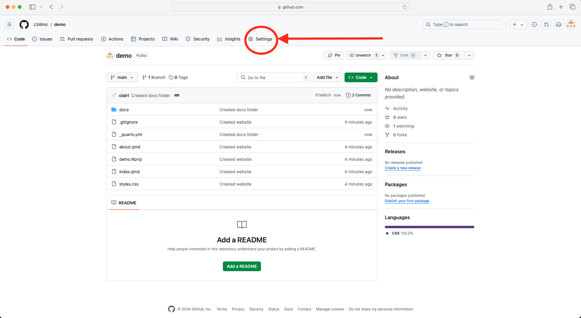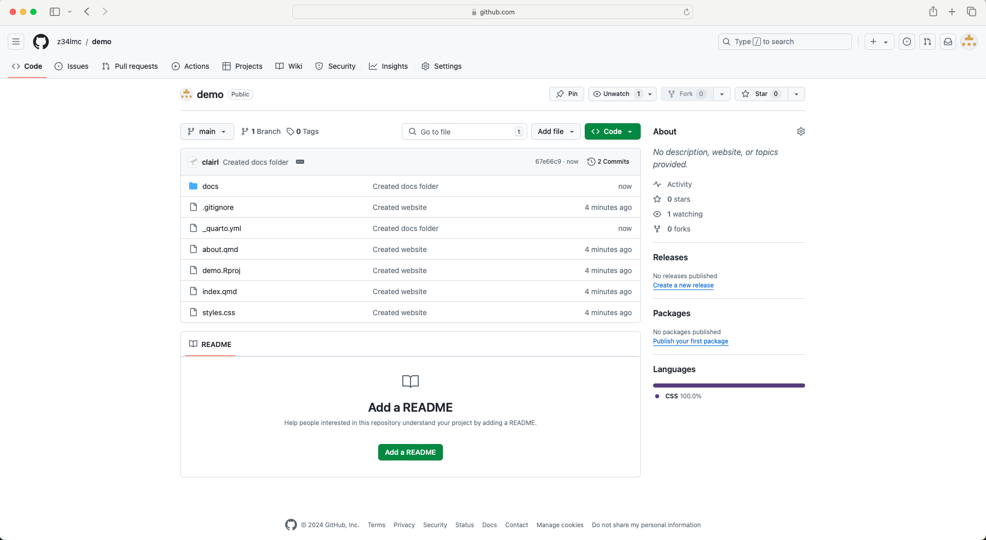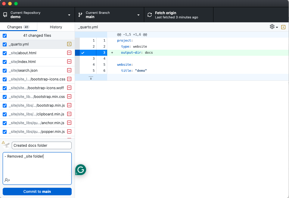 project: include the code output-dir: docs and render the website. This will save the website files in a newly created docs folder.